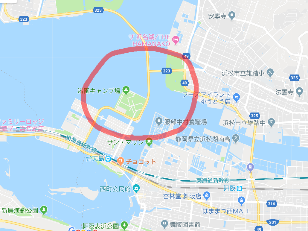 次の目的地を最寄りの駅(舞阪駅)にしてたんですが、2つ離れた弁天島駅をリターゲティングしたので距離的にはちょっと延びてしまいますが、